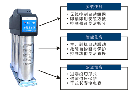 SFC型智能電容器可單臺(tái)使用,也可多臺(tái)構(gòu)成補(bǔ)償系統(tǒng),可方便地實(shí)施就地、分散、集中自動(dòng)補(bǔ)償功能。采用該產(chǎn)品可改變傳統(tǒng)無(wú)功補(bǔ)償裝置體積龐大和笨重的結(jié)構(gòu)模式,從而使新一代低壓無(wú)功補(bǔ)償裝置具有更好補(bǔ)償效果,更小體積、更低功耗、使用更靈活、維護(hù)更方便。
