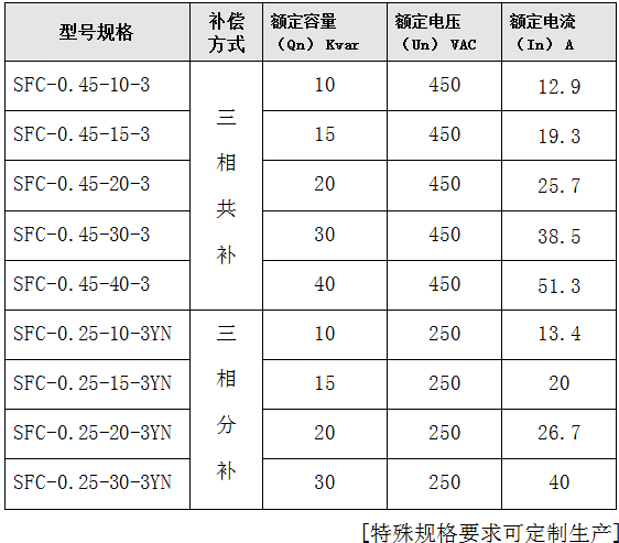 SFC型智能電容器常用規(guī)格表